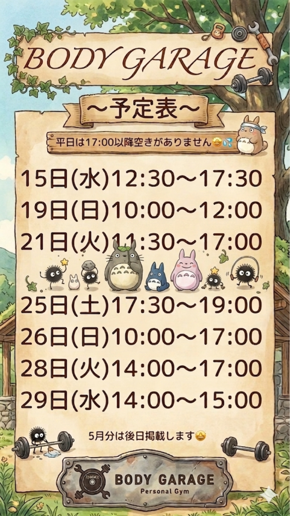 いつもありがとうございます🙇 富山県高岡市にあるパーソナルジム BODY GARAGEの石築(いしずき)です😊 4月の残りの予定は下記の通りです。 記載がない日程と時間は空き […]